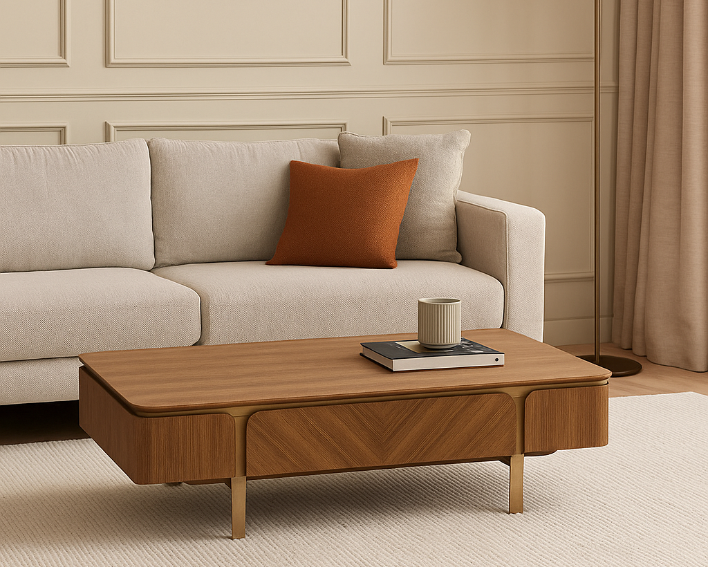 The Averro Coffee Table combines timeless craftsmanship with modern design. Made from high-quality wood in a warm walnut finish, its smooth surface and rounded edges reflect contemporary elegance. Supported by slim golden legs, it brings a luxurious touch to any living room. Designed for both beauty and practicality, Averro is the perfect centerpiece for gatherings, décor, and everyday living.